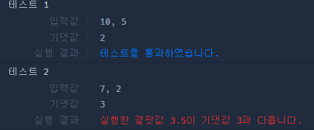 테스트 2 에서 3.5의 값이나와 실패하게 되었다. 몫만을 리턴하는게 아닌 나머지까지 계산이 된 값을 리턴해 주었다.